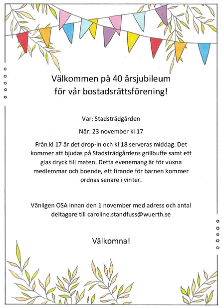 Vi hoppas att ni alla har haft en fin sommar och en skön semester. Nu är hösten här och därför vill vi välkomna alla medlemmar till årets sista städdag. Den 14 oktober samlas vi klockan 09.00 utanför tvättstugan där arbetsfördelning kommer att ske.
