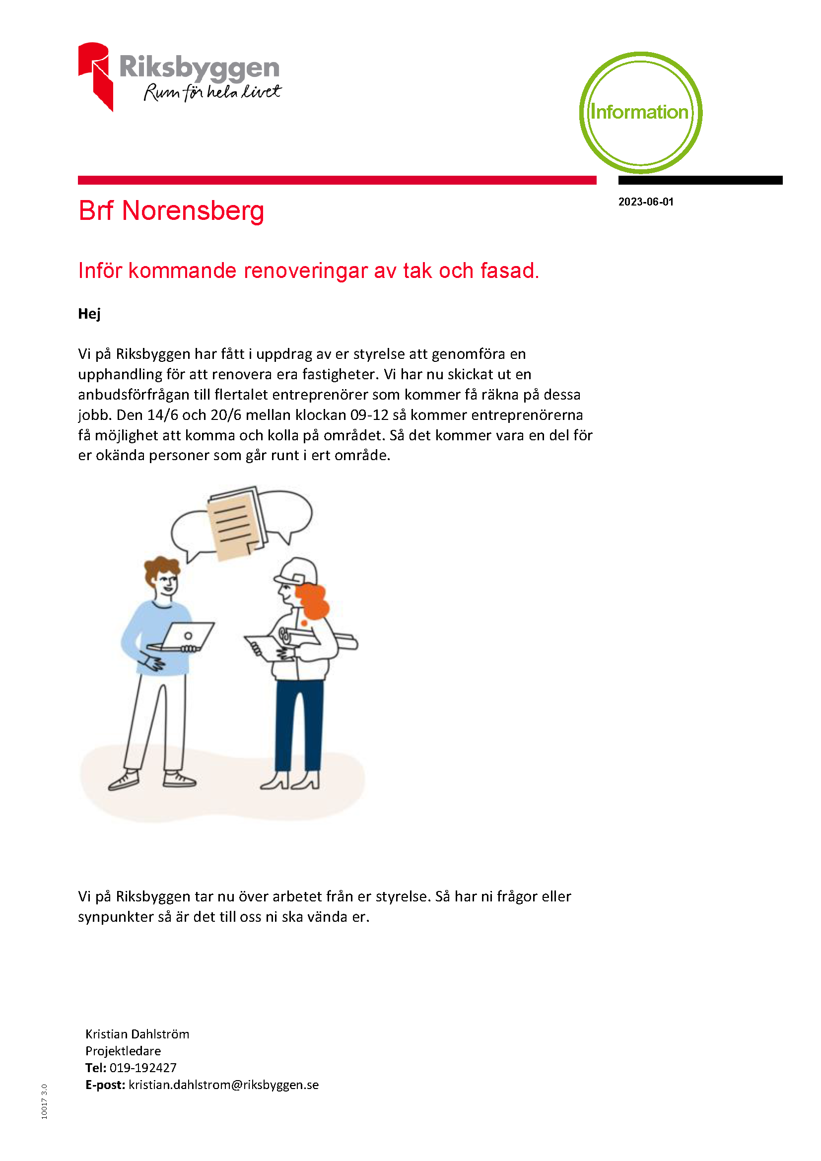 Arbetet med renovering och underhåll av föreningens bestånd fortgår. Det som skall åtgärdas enligt underhållsplan är byte av rutten panel, målning av fasader, byte av tak och plåtdetaljer. Det är ett stort projekt och Riksbyggen hjälper oss med inhämtning av offerter. Just nu har det inkommit tre offerter och en dialog med leverantörer har inletts.