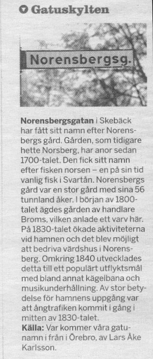 Nerikes Allehanda har under senare tid då och då haft artiklar om bakgrunden till några av Örebro´s gatunamn. Bl.a. en artikel om Norensbergsgatan som för övrigt låg längre norrut än den gör idag.